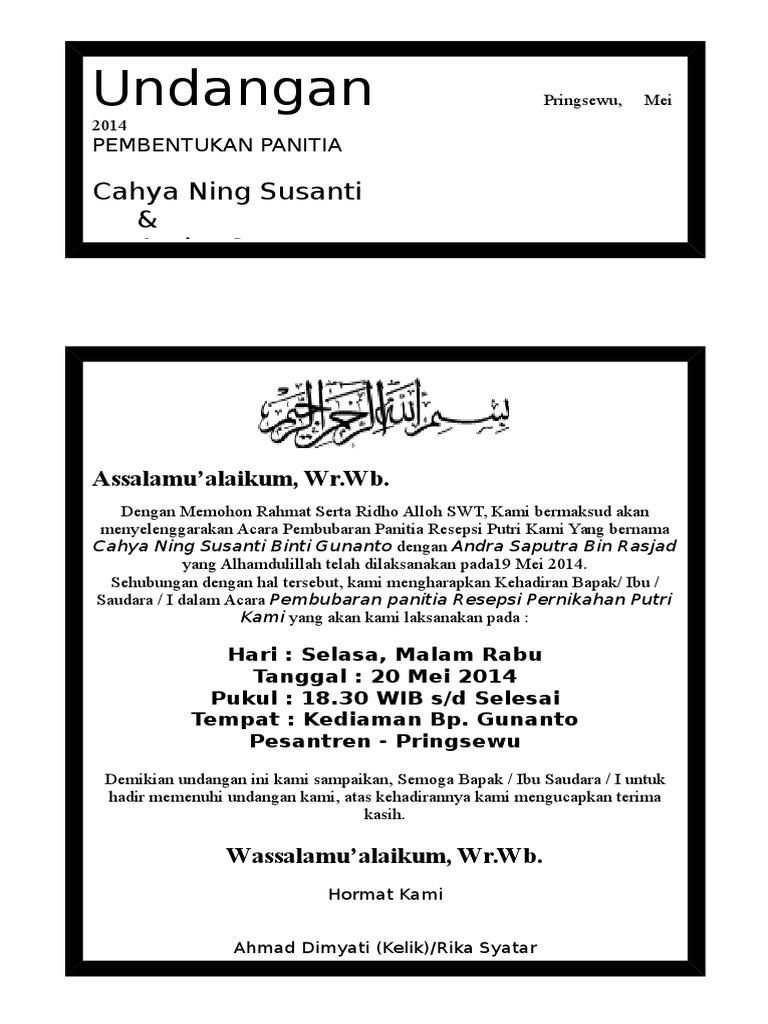 Undangan mbolo wekisabtu, 28 november 2015kepada yth,bapak/ibu/sdr/i : 81%(16)81% found this document useful (16 votes). Demikian undangan ini kami buat dan kehadiran bapak. Mohon maaf apabila ada kesalahan dalampenulisan nama dan gelar. Ada banyak macam jenis surat undangan seperti pernikahan, pengajian, sunatan, dan lainnya. Sekian informasi tentang download undangan pembentukan panitia pernikahan doc yang bisa admin sampaikan. Savesave contoh surat undangan rapat panitia. Untuk mendapatkan file contoh surat undangan rapat perusahaan yang tidak diproteksi dan bebas untuk diedit, silahkan anda kunjungi situs kami. Seperti yang sudah kita ketahui, sebuah perusahaan panitia. Koleksi kumpulan contoh undangan khitanan doc download. Beberapa jenis surat undangan yang sering dipergunakan, diantaranya adalah contoh surat undangan rapat, undangan resmi, undangan pernikahan, undangan ulang. Ada dua jenis surat undangan yaitu surat undangan tidak resmi dan resmi. Atas kehadirannya dan perhatiannya kami ucapkan terima kasih.hari :